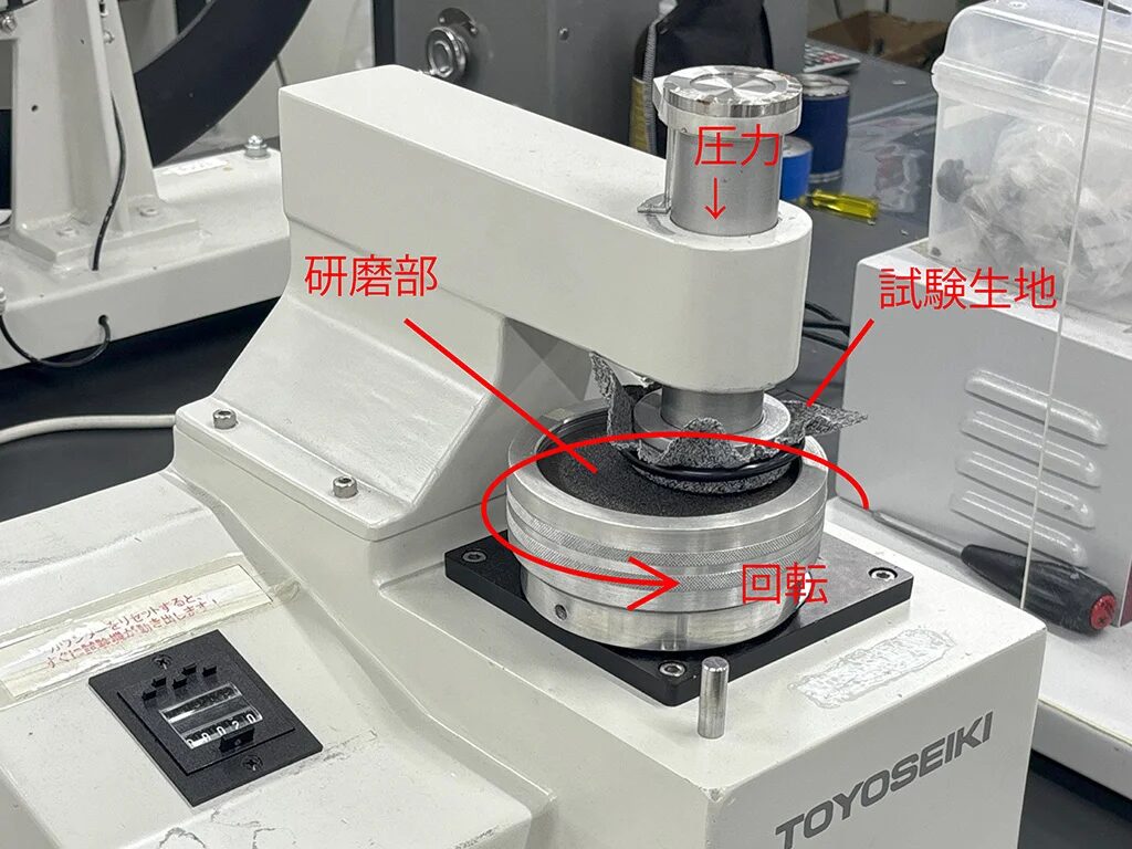 これは、摩擦板で生地に強い摩擦を加え、強制的に毛玉の発生状況を見る過酷なテストです。