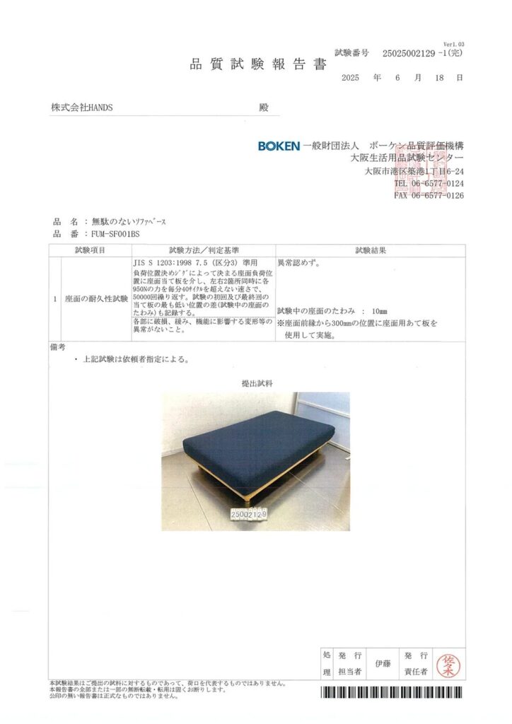 Fumiのソファは、非常に厳しい耐久試験で「へたりにくさ」を証明しています。